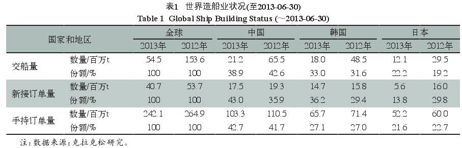 經(jīng)過(guò)近10年造船行業(yè)的快速發(fā)展,我國(guó)現(xiàn)在超過(guò)韓國(guó)、日本成為世界第一造船大國(guó)。表1為至2013年6月30日世界造船業(yè)狀況。