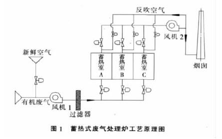 RTO設(shè)備的工作原理見圖1。該設(shè)備有3個(gè)對(duì)稱的蓄熱室和2個(gè)燃燒室,有機(jī)廢氣在鼓風(fēng)機(jī)作用下先進(jìn)入陶瓷蓄熱室A,吸熱后進(jìn)入燃燒室,蓄熱室A因放熱而降溫,燃燒升溫后的氣體進(jìn)入蓄熱室B,通過熱交換把熱量蓄存在蓄熱室B的陶瓷蓄熱體中,然后排出。同時(shí)蓄熱室C空間中殘留未處理有機(jī)廢氣被凈化后的氣體反吹回燃燒室進(jìn)行焚化處理。經(jīng)過一定時(shí)間(約2min)后,氣流改變方向從蓄熱室B進(jìn)入燃燒室,通過蓄熱室B吸收熱量升溫后,在爐膛內(nèi)高溫焚化,最后經(jīng)蓄熱室C熱交換后排放,同時(shí)蓄熱室A處于反吹掃狀態(tài),經(jīng)一定時(shí)間(約2min)后,氣流再改變方向,不斷地交替循環(huán),保證燃燒室溫度在800°C以上,從而保證高的去除率和換熱效率。