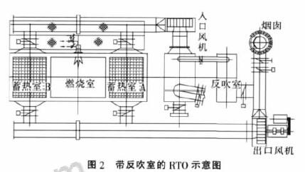 可以看出圖中除蓄熱室(A)、蓄熱室(B)和燃燒室外,在氣體排放處增加了反吹室。反吹室的目的就是在換向過程中將外排的氣體通過切斷閥的控制先導(dǎo)入反吹室,而反吹室內(nèi)的空氣外排、換向完成后,風(fēng)機(jī)先將反吹室內(nèi)的氣體反吹到RTO內(nèi)部,這樣反復(fù)進(jìn)行,解決了氣體在換向過程的外排,可以將RTO的廢氣處理率提高5%。