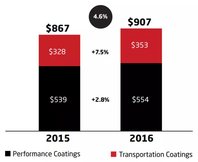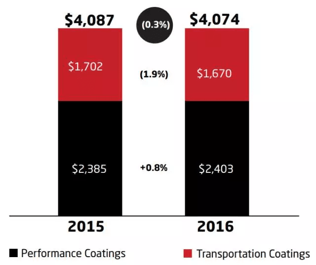 艾仕得交通運輸涂料部門,2016財年凈銷售額為16.70億美元,同比下降1.9%。該部門為輕型商用車的OEM提供先進的涂層技術。其終端市場為輕型車、商用車。