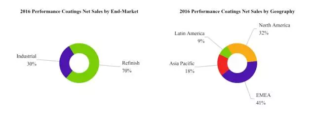 財報顯示,按銷售額來看,汽車修補漆、工業(yè)涂料銷售額占高性能涂料部門比分別為70%、30%。按地理來看,EMEA(歐洲、中東和非洲)、北美地區(qū)、亞太地區(qū)、拉丁美洲地區(qū)的銷售額分別占比為41%、32%、18%、9%。