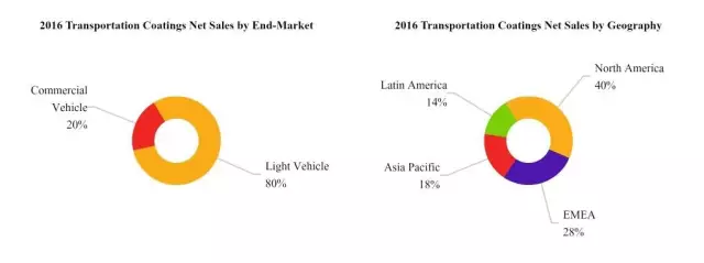 財報顯示,按銷售額來看,輕型車、商用車銷售額占交通運輸涂料部門比分別為80%、20%。按地理來看,EMEA(歐洲、中東和非洲)、北美地區(qū)、亞太地區(qū)、拉丁美洲地區(qū)的銷售額分別占比為28%、40%、18%、14%。