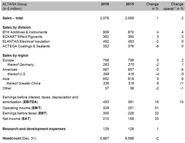 在2016年,阿爾塔納集團(tuán)畢克助劑和儀器部的銷售額同比增長4%,達(dá)到9.09億歐元;愛卡特殊效果顏料部的銷售額為3.62億歐元,同比增長3%;艾倫塔斯電氣絕緣材料部的銷售額同比下降2%,達(dá)4.52億歐元;ACTEGA涂料和密封材料部的銷售額同比下降6%,為3.52億歐元。