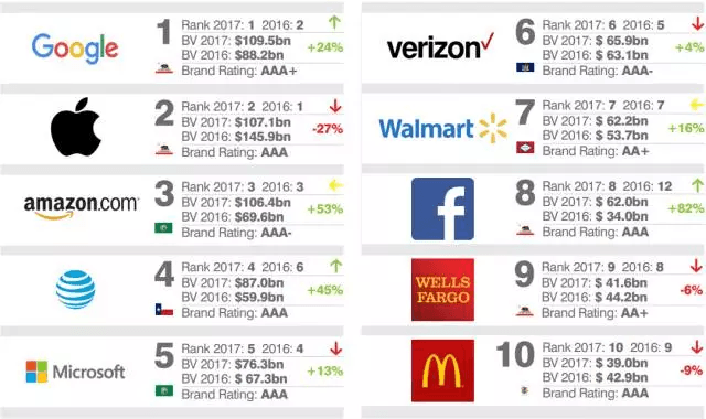 榜單顯示,谷歌擊敗蘋果和亞馬遜,成為美國最有價值品牌,價值為1090億美元,比去年上漲了24%。而名列第二位的蘋果的品牌價值則下跌了27%,至1070億美元。亞馬遜以1060億美元的估值排在第三位,與去年同期相比其品牌價值增長53%??傮w來說,美國500強品牌價值超過3萬億美元,比去年同期增長11%。