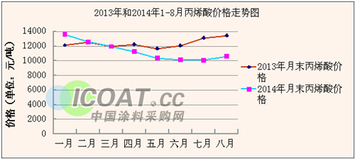 【中國(guó)涂料采購(gòu)網(wǎng)】目前建筑涂料在整個(gè)涂料市場(chǎng)占主導(dǎo)地位,有數(shù)據(jù)顯示建筑涂料約占行業(yè)產(chǎn)量的48%左右,大部分涂料企業(yè)都會(huì)涉足建筑涂料領(lǐng)域,作為建筑涂料用料之一的丙烯酸其市場(chǎng)行情也倍受涂料行業(yè)關(guān)注,因此我們對(duì)2014年1~8月市場(chǎng)價(jià)格走勢(shì)及未來發(fā)展趨勢(shì)做詳細(xì)的分析。