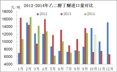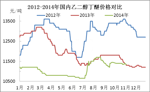 圖1為2012-2014年國(guó)內(nèi)乙二醇丁醚華東市場(chǎng)價(jià)格走勢(shì)對(duì)比。近3年來,國(guó)內(nèi)市場(chǎng)價(jià)格震蕩起伏,但不難發(fā)現(xiàn),年末、年初及年中階段,乙二醇丁醚市場(chǎng)價(jià)格進(jìn)入谷底,清明節(jié)后及傳統(tǒng)旺季期間(金九銀十),市場(chǎng)將迎來反彈狂潮。然2014年市場(chǎng)一反常態(tài),上半年,市場(chǎng)供需矛盾凸顯,價(jià)格持續(xù)走軟,直至下半年,因國(guó)內(nèi)外裝置檢修,社會(huì)庫存減緩等利好提振下,市場(chǎng)小幅反彈,然反彈力度有限,與去年價(jià)格相比暫無較大差異,然與2012年同期相比,價(jià)差均在1000元/噸以上,慘不忍睹。年末,市場(chǎng)需求轉(zhuǎn)淡,供應(yīng)壓力凸顯,廠商量?jī)r(jià)不能兩全,市場(chǎng)低價(jià)探市者頻現(xiàn),因此小編認(rèn)為今年市場(chǎng)也不能逃脫跌價(jià)的魔咒,然全年來看企業(yè)盈利微薄,企業(yè)運(yùn)營(yíng)壓力不減,大幅降價(jià)的可能性不大,跌幅控制在100-200元/噸附近,僵持運(yùn)行為主。