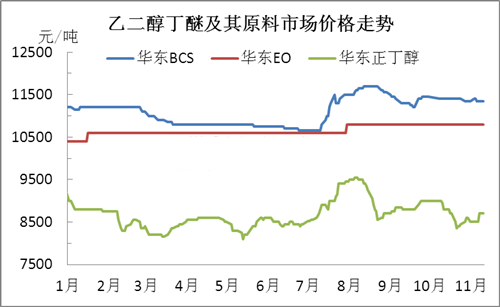 今年以來,雙原料環(huán)氧乙烷、正丁醇價(jià)格震蕩運(yùn)行。由圖2可知,乙二醇丁醚價(jià)格走勢(shì)與正丁醇價(jià)格波動(dòng)較為相近,說明正丁醇對(duì)乙二醇丁醚價(jià)格影響較大。近期油價(jià)暴跌,部分化工產(chǎn)品隨之下行,然正丁醇因部分廠商裝置停車,社會(huì)整體供應(yīng)能力偏低,因此油價(jià)狂跌時(shí),市場(chǎng)并沒有緊跟跌勢(shì),11月份因裝置檢修等利好提振,價(jià)格呈上行趨勢(shì)。另一原料環(huán)氧乙烷,行情持續(xù)低迷,跌價(jià)傳聞釋放已久,遲遲不見實(shí)際下調(diào)跡象,成本支撐下,目前乙二醇丁醚市場(chǎng)暫僵持運(yùn)行。然多數(shù)業(yè)者對(duì)原料后期持悲觀預(yù)期,國(guó)外生產(chǎn)廠商產(chǎn)銷承壓,外盤已窄幅下調(diào),后續(xù)仍有回調(diào)空間,因此年末國(guó)內(nèi)外成本面均顯弱勢(shì),加劇乙二醇丁醚市場(chǎng)看空氣氛。