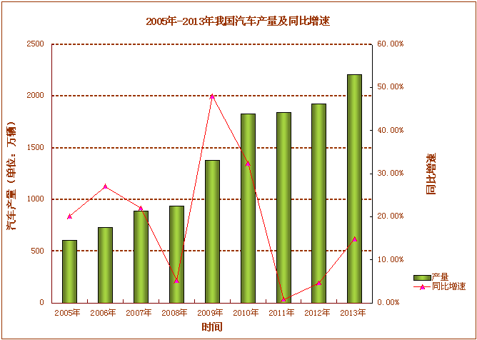 2005年-2013年我國(guó)汽車(chē)年產(chǎn)量及同比增速
