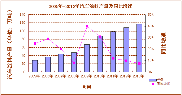 2005年-2013年我國(guó)汽車(chē)涂料年產(chǎn)量及同比增速
