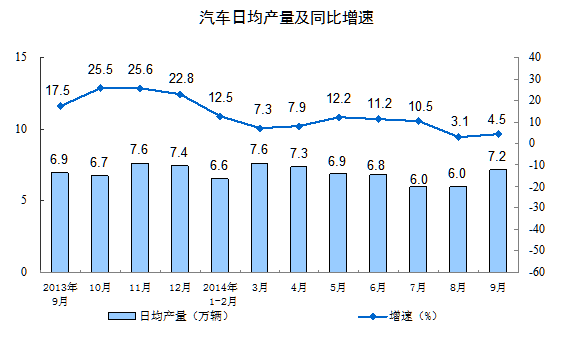 2013年9月-2014年9月我國(guó)汽車(chē)日均產(chǎn)量及同比增速
