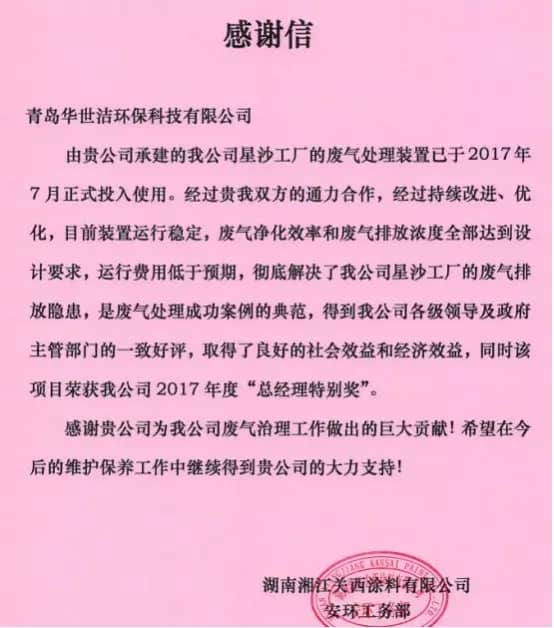 對于一家企業(yè)來說,最大的成就莫過于用戶的認(rèn)可。近日,青島華世潔環(huán)??萍加邢薰?以下簡稱“華世潔”)收到湖南湘江關(guān)西涂料有限公司和展辰新材料股份有限公司的感謝信和表揚(yáng)信,對華世潔的產(chǎn)品品質(zhì)量以及服務(wù)水平給予了高度的認(rèn)可。