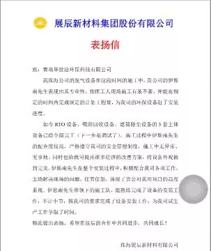 國內(nèi)建筑涂料龍頭企業(yè)之一的展辰新材料集團(tuán)股份有限公司也對華世潔的產(chǎn)品及服務(wù)非常滿意,并給華世潔發(fā)來了表揚(yáng)信稱,在展辰珠海公司的廢氣設(shè)備施工過程中,華世潔的伊斯南先生表現(xiàn)出其專業(yè)性,指揮工人現(xiàn)場施工有條不紊,并能在規(guī)定的時(shí)間內(nèi)完成制定的計(jì)劃工程,如今RTO設(shè)備、吸附回收設(shè)備、濾筒除塵設(shè)備的3套主體設(shè)備已經(jīng)全面完工,施工過程中伊斯南先生嚴(yán)格遵守展辰的安全管理制度,施工中無異常,無事故。同時(shí)也給展辰提出很多經(jīng)濟(jì)的改善方案。