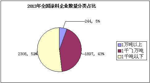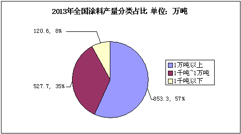 通過(guò)對(duì)“2013年全國(guó)涂料企業(yè)數(shù)量分類(lèi)占比”及“2013年全國(guó)涂料產(chǎn)量分類(lèi)占比”兩張圖的對(duì)比情況來(lái)看,2013年我國(guó)涂料行業(yè)年產(chǎn)量1萬(wàn)噸以上的企業(yè)共有244家,占涂料企業(yè)總數(shù)的5%,而這5%的大型涂料企業(yè)的產(chǎn)量占到全國(guó)涂料生產(chǎn)總量的57%;1千~1萬(wàn)噸的中型涂料企業(yè)共有1897家,占涂料企業(yè)新企業(yè)總數(shù)的43%,其生產(chǎn)總量為527.7萬(wàn)噸,占全國(guó)涂料生產(chǎn)總量的35%;1千噸以下的涂料生產(chǎn)企業(yè)達(dá)到2308家,占到整個(gè)涂料行業(yè)的52%;其總產(chǎn)量為120.6萬(wàn)噸,占全國(guó)涂料總產(chǎn)量的8%。