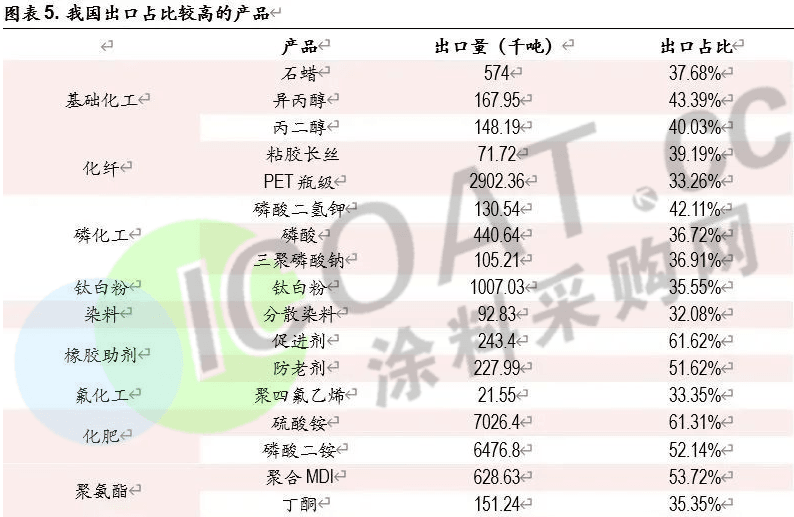 外貿(mào)出口數(shù)據(jù)下滑,化工企業(yè)利潤(rùn)腰斬,這也給主攻外貿(mào)的化工企業(yè),乃至更多的基礎(chǔ)化工原材料企業(yè)帶來(lái)了極大的壓力,似乎沒(méi)有哪個(gè)企業(yè)能夠獨(dú)善其身。據(jù)涂料采購(gòu)網(wǎng)不完全統(tǒng)計(jì),出口占比超過(guò)30%的產(chǎn)品主要包括橡膠助劑、鈦白粉、聚氨酯、染料、磷化工、肥料等產(chǎn)品,促進(jìn)劑、防老劑、硫酸銨、磷酸二銨、聚合MDI等產(chǎn)品出口占比更是高達(dá)50%以上。