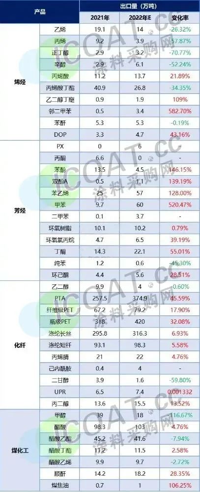 2022年化工行業(yè)累計(jì)出口額3049.5億美元,占全行業(yè)累計(jì)出口總額比重為80.4%。其中烯烴、芳烴、化纖、煤化工等領(lǐng)域的乙烯、丙烯、正丁醇、PX、二甲苯、雙酚A等多種化工品出口數(shù)量較大,全年約2000萬(wàn)噸化工品出口,涉及品類近400種。