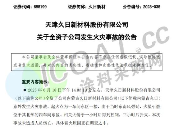 近日,化工行業(yè)上市公司天津久日新材料股份有限公司發(fā)布公告,稱全資子公司內(nèi)蒙古久日意外發(fā)生火災(zāi)事故,本次事故未造成人員傷亡,具體著火原因正在調(diào)查之中。