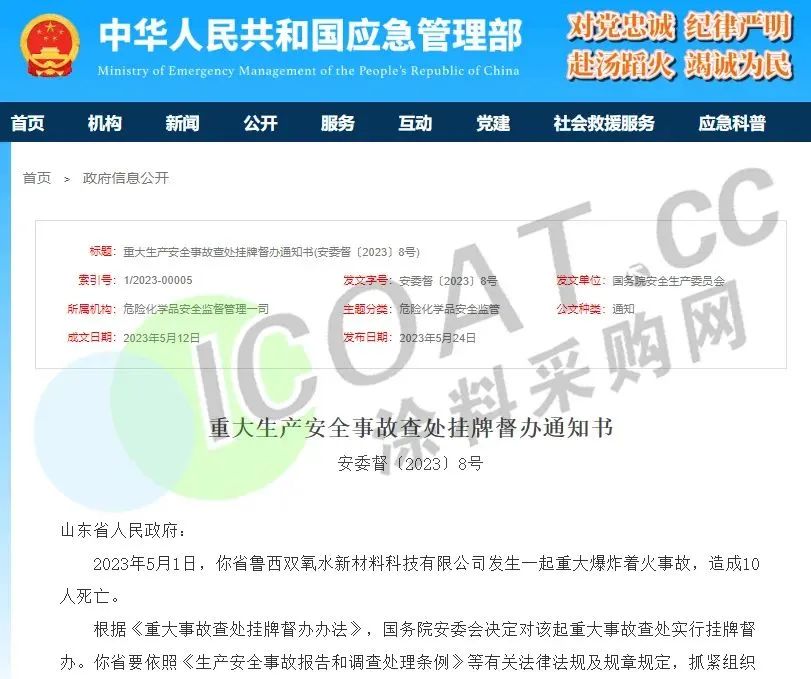 5月1日,中化集團(tuán)魯西化工集團(tuán)聊城魯西雙氧水新材料科技有限公司發(fā)生爆炸著火事故,事故造成10人死亡。