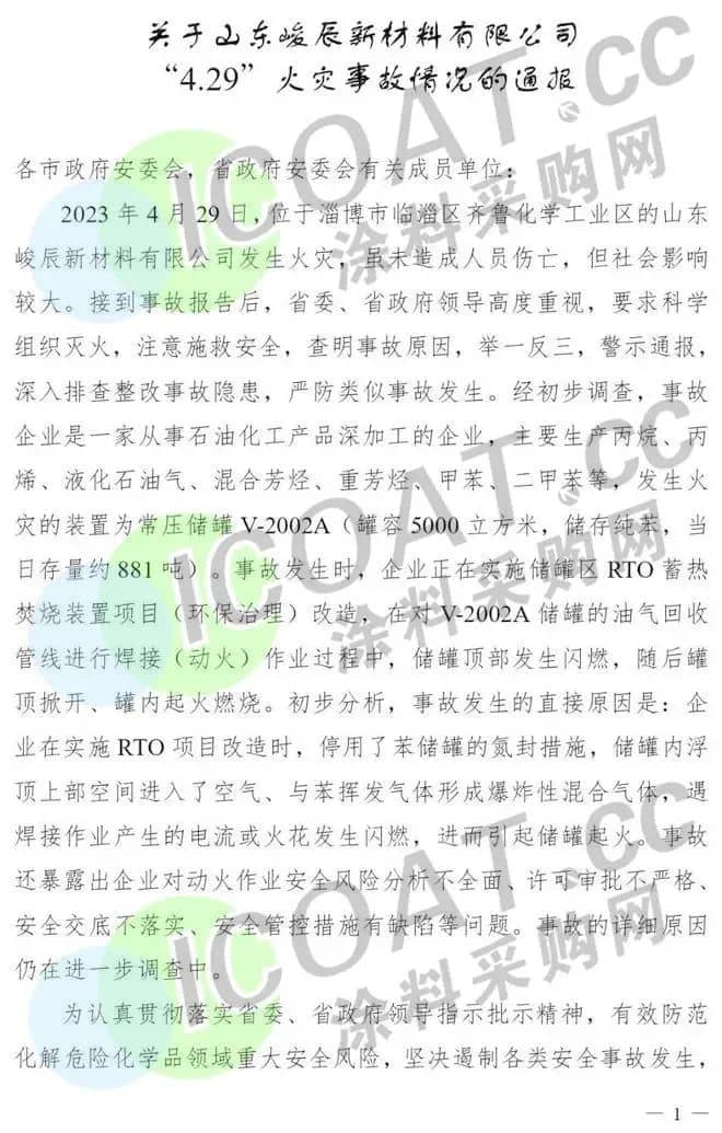 4月29日,山東淄博峻辰新材料有限公司西罐區(qū)一純苯儲(chǔ)罐(內(nèi)浮頂罐,容積5000立方)發(fā)生火災(zāi)事故,未造成人員傷亡。