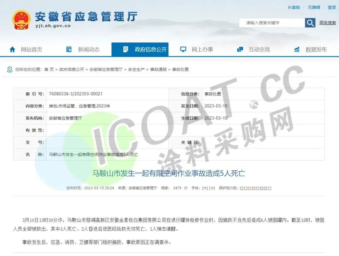 3月10日,馬鞍山市慈湖高新區(qū)安徽金星鈦白集團(tuán)有限公司發(fā)生中毒窒息事故,因施救不當(dāng)先后造成6人被困罐內(nèi),造成5人死亡、1人受傷。