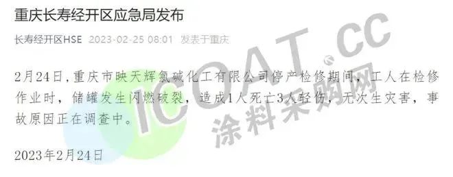 2月24日,重慶市映天輝氯堿化工公司停產(chǎn)檢修期間,工人檢修作業(yè)時(shí)儲(chǔ)罐發(fā)生閃燃破裂,造成1人死亡3人輕傷,事故原因正調(diào)查。