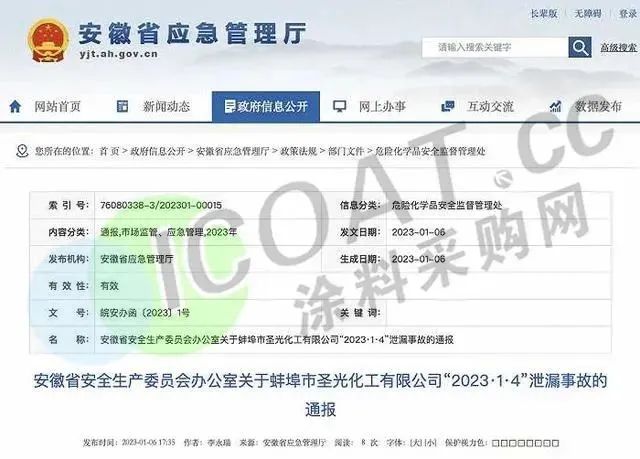 1月4日,安徽省蚌埠市圣光化工有限公司發(fā)生混酸(硫酸和硝酸混合物)泄漏事故,事故未造成人員傷亡,但造成較大社會(huì)影響。