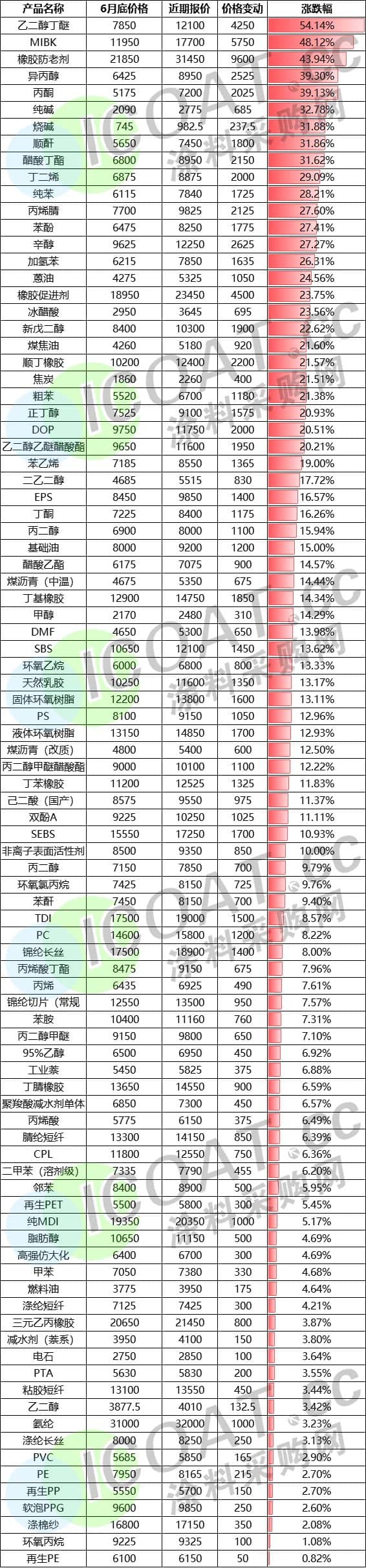 近期國內(nèi)化工原材料價(jià)格波動(dòng)非常頻繁,縱觀全局走勢(shì),自2023年下半年以來漲價(jià)的化工品數(shù)量超過100種。其中乙二醇丁醚漲幅54.14%,超過50%。MIBK、異丙醇、丙酮、純堿等漲幅在30%-50%區(qū)間以上;丁二烯、純苯、丙烯腈、苯酚、辛醇、新戊二醇、粗苯漲幅在20%-30%區(qū)間;苯乙烯、固體環(huán)氧樹脂、液體環(huán)氧樹脂、雙酚A漲幅在10%-20%區(qū)間;丙二醇、TDI、丙烯、苯胺、純MDI、PTA、PVC漲幅在10%以下。
