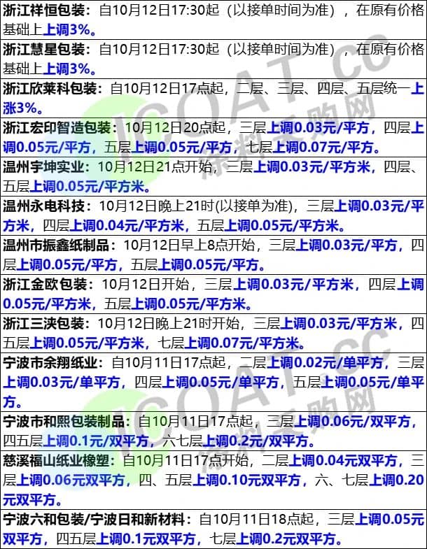 包裝紙市場(chǎng),玖龍紙業(yè)重慶基地、四川基地再度漲價(jià),部分紙種單次上漲力度高達(dá)150元/噸。玖牛、海牛、地優(yōu)、地牛上調(diào)50元/噸,地再、江再上調(diào)100元/噸,玖瓦、海瓦上調(diào)50元/噸,江瓦上調(diào)100元/噸,灰底白上調(diào)150元/噸。下游紙板市場(chǎng)也持續(xù)上調(diào),10月11日-10月12日,華東地區(qū)又有大批紙板廠發(fā)布漲價(jià)函,漲幅在3%左右。