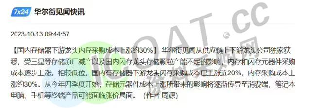 存儲(chǔ)器行業(yè),受三星等存儲(chǔ)原廠減產(chǎn)以及國內(nèi)閃存龍頭存儲(chǔ)顆粒產(chǎn)能不足的影響,內(nèi)存和閃存元器件采購成本逐步上漲,相較此前低位,國內(nèi)有存儲(chǔ)器下游龍頭閃存采購成本已上漲近20%,內(nèi)存采購成本上漲約30%。