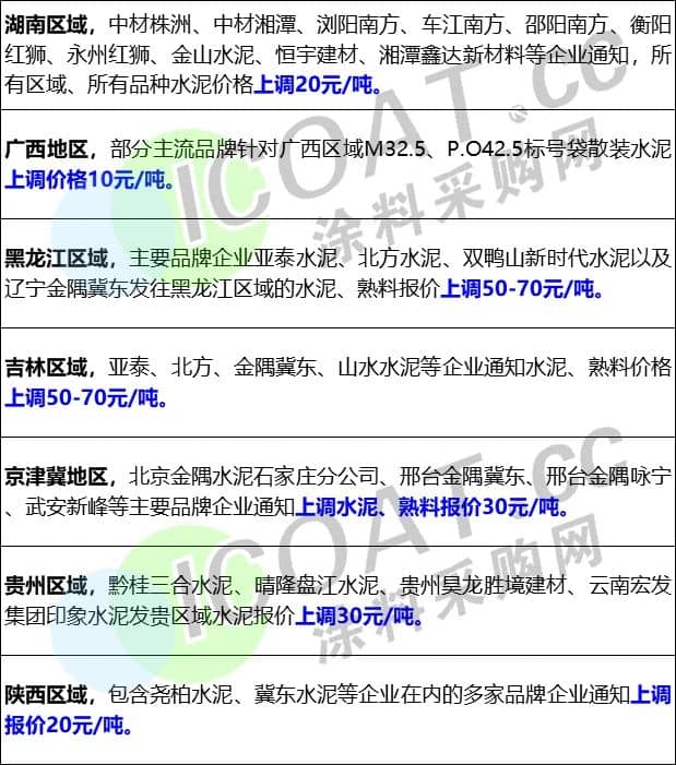 10月中旬以來,云南、貴州、四川、重慶、河北、湖南、陜西、遼寧、吉林、黑龍江、廣西等省市自治區(qū)水泥價(jià)格恢復(fù)性上調(diào)。