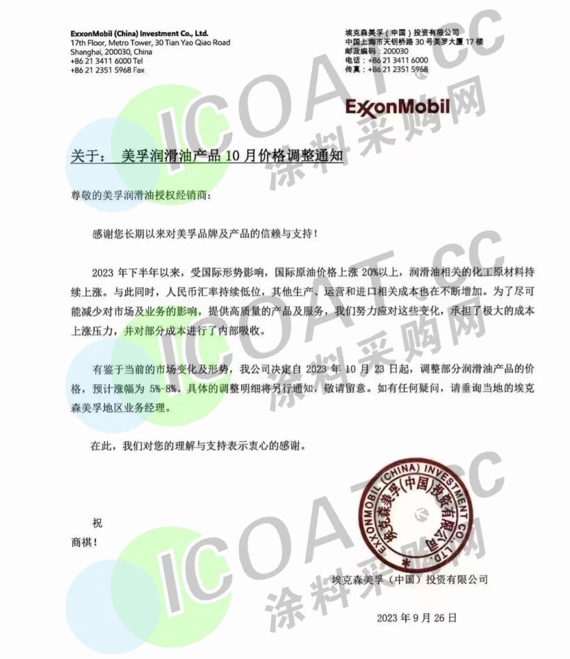 美孚潤(rùn)滑油表示,自10月23日起,調(diào)整部分潤(rùn)滑油產(chǎn)品的價(jià)格,預(yù)計(jì)漲幅為5%-8%。