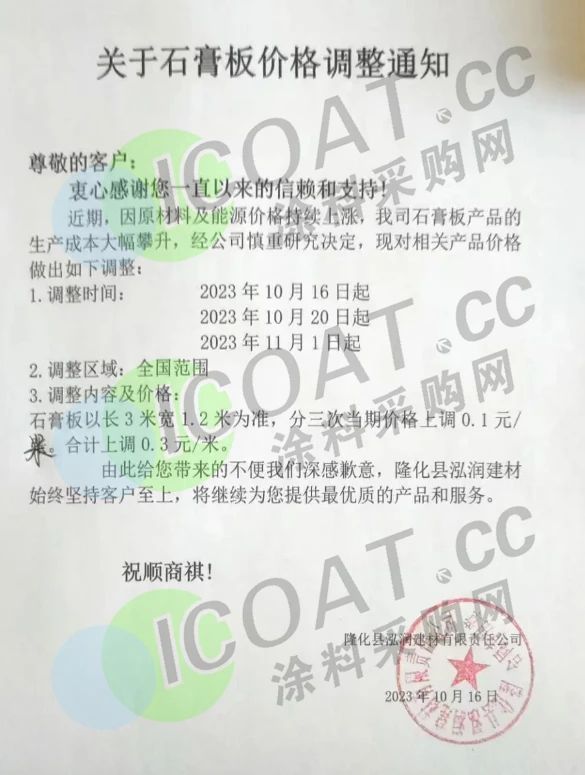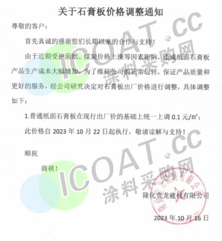 隆化壹龍建材宣布,10月22日起,普通紙面石膏板在現(xiàn)行基礎(chǔ)上統(tǒng)一上調(diào)0.1元/㎡。