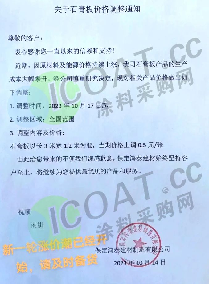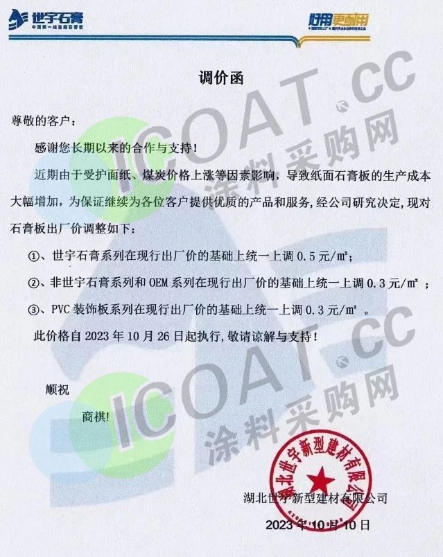湖北世宇新型建材表示,10月26日起,世宇石膏在現(xiàn)行出廠價(jià)基礎(chǔ)上統(tǒng)一上調(diào)0.5元/㎡,非世宇石膏和OEM系列在現(xiàn)行出廠價(jià)的基礎(chǔ)上統(tǒng)一上調(diào)0.3元/㎡,PVC裝飾板系列在現(xiàn)行出廠價(jià)的基礎(chǔ)上統(tǒng)一上調(diào)0.3元/㎡。