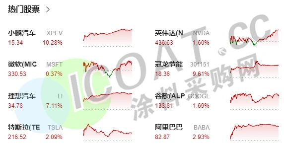 熱門中概股全線上漲,阿里巴巴漲2.93%,京東漲1.81%,拼多多漲3.98%,蔚來(lái)汽車漲6.59%,小鵬汽車漲10.28%,理想汽車漲7.11%,嗶哩嗶哩漲7.36%,百度漲3.75%,新東方漲3.65%,網(wǎng)易漲5.09%,騰訊音樂漲5.15%,愛奇藝漲5.27%。