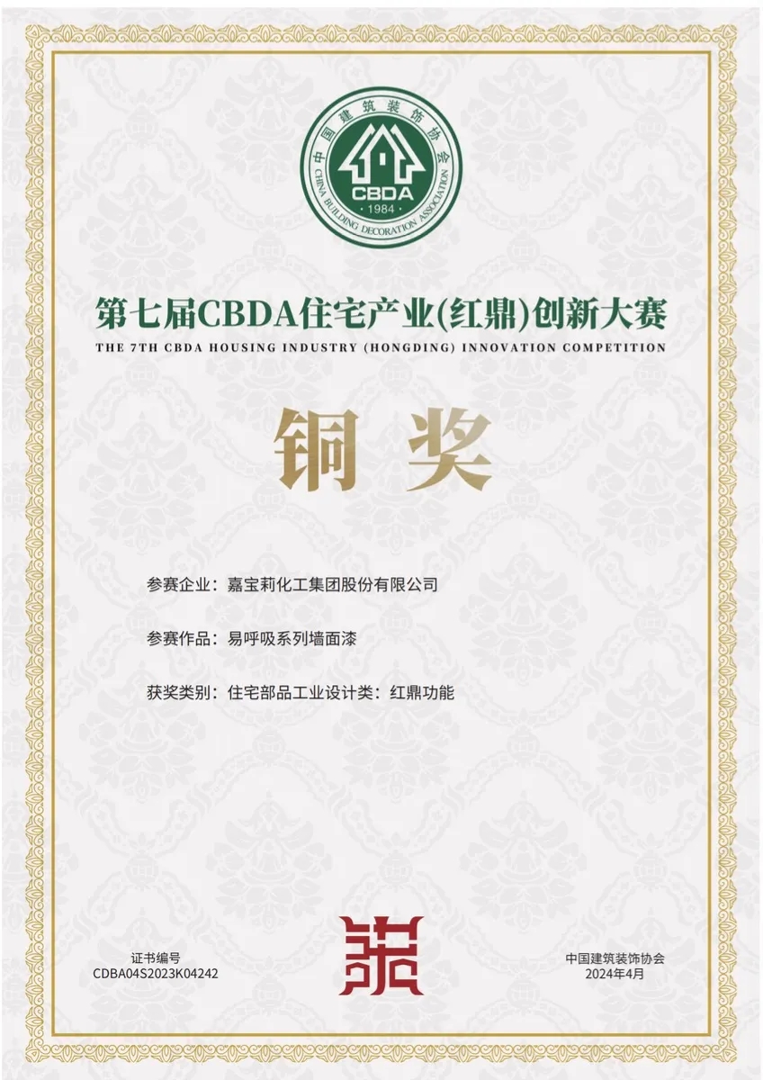 近日,第七屆CBDA住宅產(chǎn)業(yè)(紅鼎)創(chuàng)新大賽結(jié)果正式發(fā)布,嘉寶莉易呼吸系列墻面漆憑借卓越的創(chuàng)新理念和出色的產(chǎn)品性能,成功斬獲銅獎。這一榮譽(yù)再次證明了嘉寶莉在墻面漆領(lǐng)域的領(lǐng)先地位和不斷創(chuàng)新的實力。