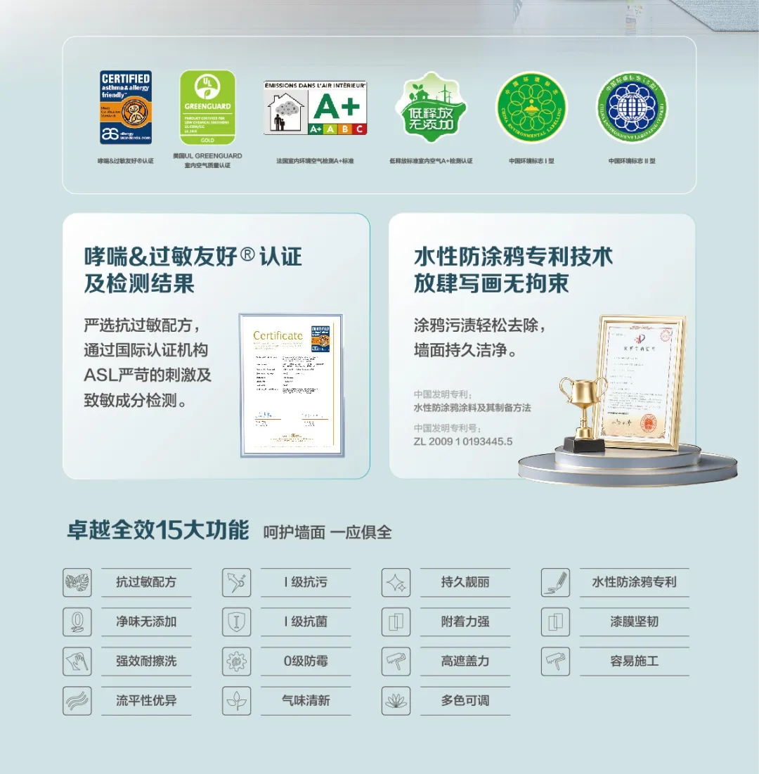 同時,該系列墻面漆獲得了綠色衛(wèi)士金級認(rèn)證、法國A+標(biāo)準(zhǔn)、低釋放A+標(biāo)準(zhǔn)、十環(huán)認(rèn)證、SGS獨立慧鑒認(rèn)證等國際權(quán)威環(huán)保認(rèn)證,這充分證明了其綠色環(huán)保的品質(zhì),讓消費者可以放心使用。此外,嘉寶莉易呼吸系列墻面漆還具備I級抗污、I級抗菌、0級防霉等全效15大功能,能夠高效抵御多種污漬,長期保持墻面的清潔和衛(wèi)生,減少細(xì)菌和霉菌的滋生,呵護(hù)墻面,一應(yīng)俱全,為家庭健康提供多一層保障。