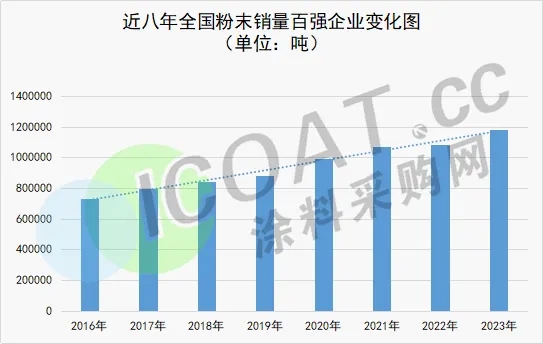 在2016年-2023年這八年中,粉末涂料百強(qiáng)銷量總體趨勢是在上升的,且前六年同比增長率在10%左右。而后在2022年出現(xiàn)增幅收窄的情況,與疫情的嚴(yán)峻和多次封控有著密切聯(lián)系。隨著封控解除和粉末行業(yè)的急切自救,2023年同比增長重回8%左右,但相較于2022年的低基數(shù)來對比,表現(xiàn)并不算亮眼,且仍有著一定的上升空間。