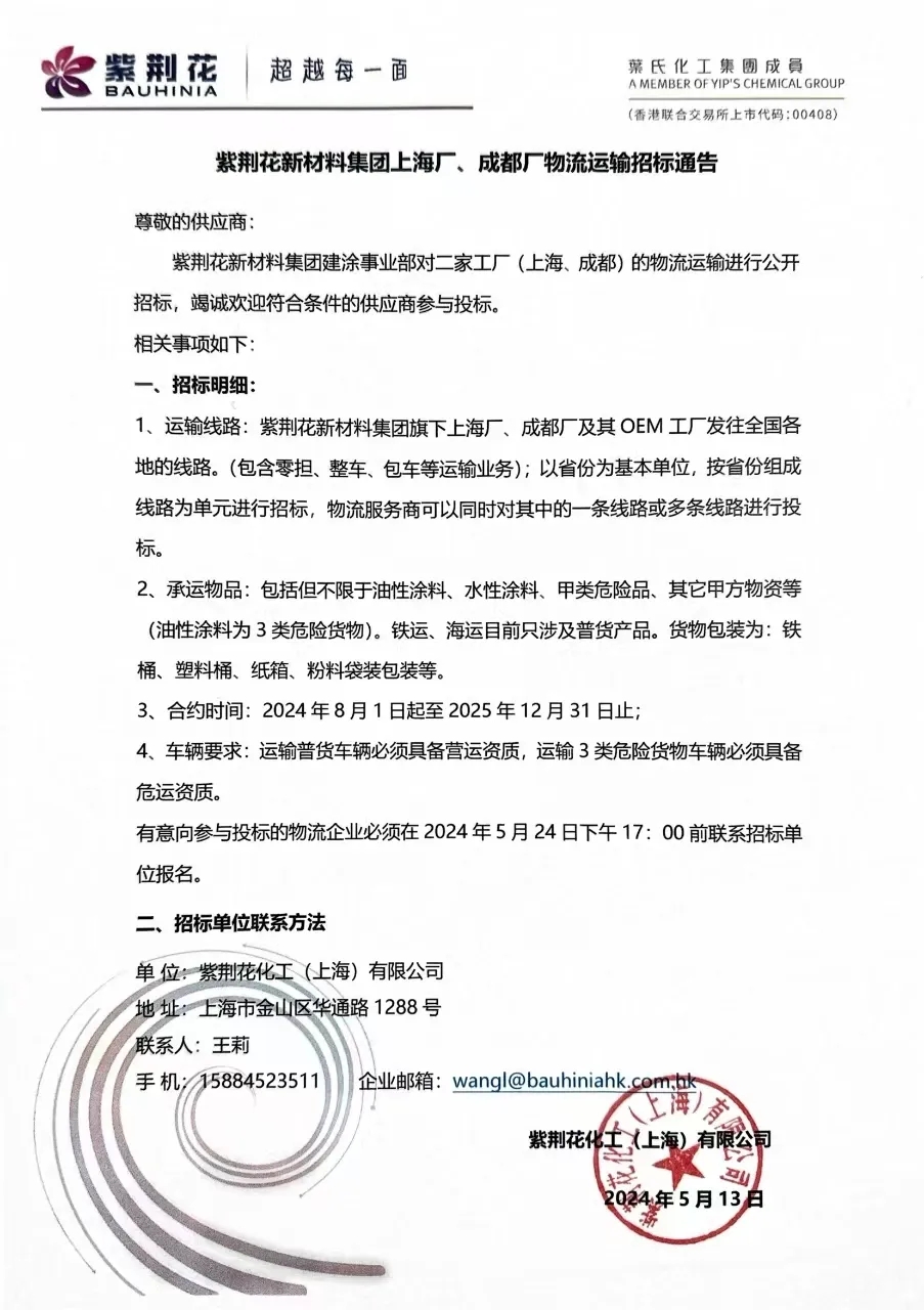 紫荊花發(fā)布紫荊花新材料集團上海廠、成都廠物流運輸招標通告。紫荊花新材料集團建涂事業(yè)部對2家工廠(上海、成都)的物流運輸進行公開招標,竭誠歡迎符合條件的供應(yīng)商參與投標。
