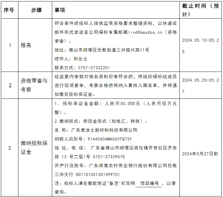 與此同時,美涂士發(fā)布全球生態(tài)智能總部二期車間設(shè)備安裝工程招標公告。廣東美涂士新材料科技有限公司根據(jù)市場情況,為了滿足建筑需求,經(jīng)公司研究,對車間設(shè)備安裝工程進行公開招標,歡迎符合條件的合格投標人參加投標,有關(guān)事項如下: