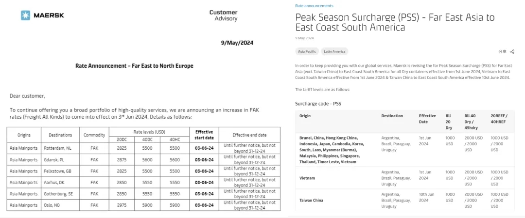 船公司們宣布新一輪運價調整計劃,馬士基和達飛兩大航運巨頭已宣布6月再提價計劃,上調北歐FAK費率。其中,馬士基每40尺柜最高5900美元,達飛再次上調1000美元,每40尺柜6000美元。赫伯羅特、HMM等船公司繼續(xù)調整部分航線的費率,涉及歐地、非洲、南美、北美等。5月上旬美線(運價)已經連漲了兩次,每次各漲了1000美元左右,漲價還將繼續(xù),并將在5月下旬飆升到5000美元以上。