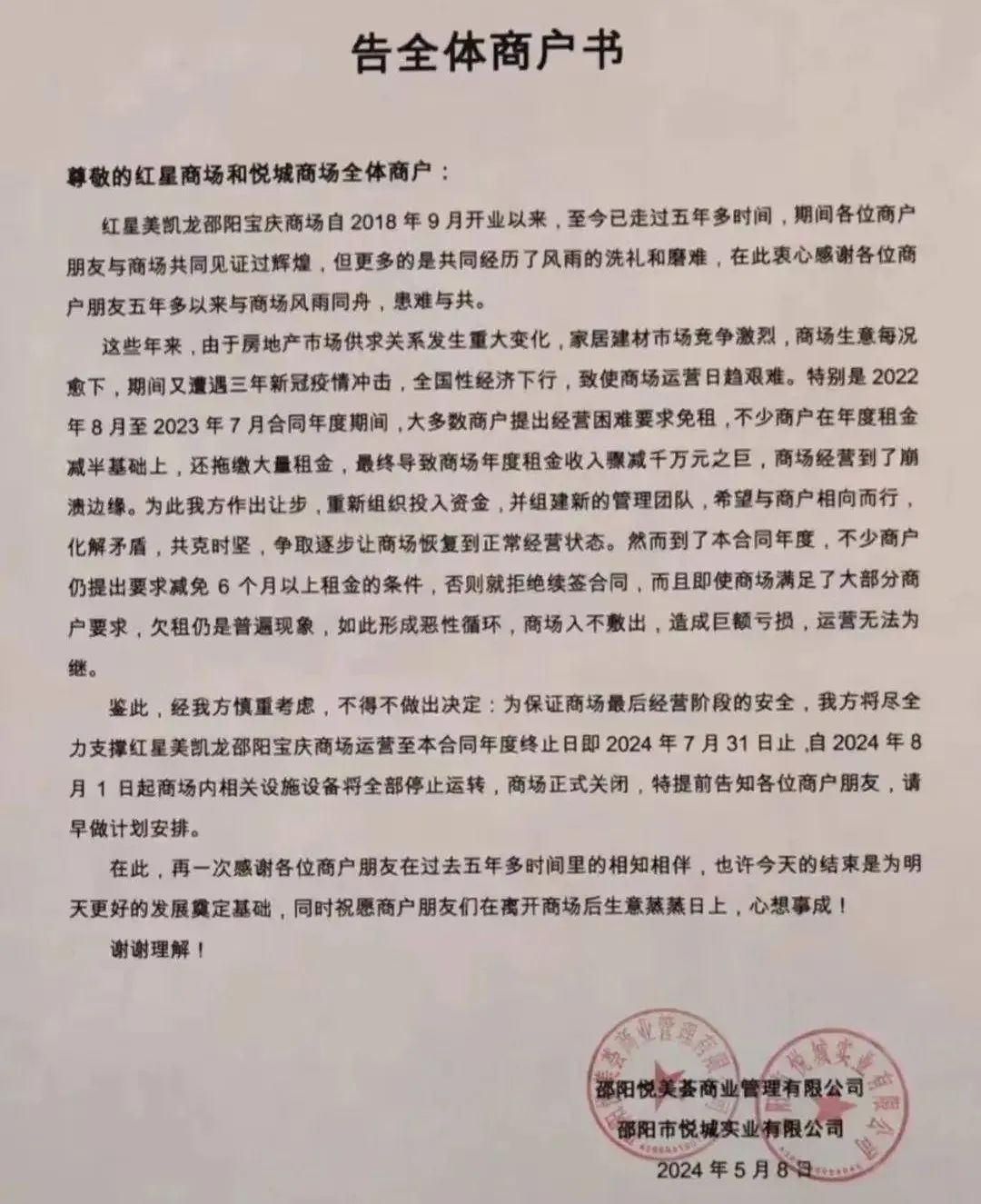 與此同時,紅星美凱龍邵陽寶慶商場也發(fā)布關(guān)于閉店的消息。稱由于商戶長期欠租,商場入不敷出,運營無法為繼,決定8月1日起正式關(guān)閉。