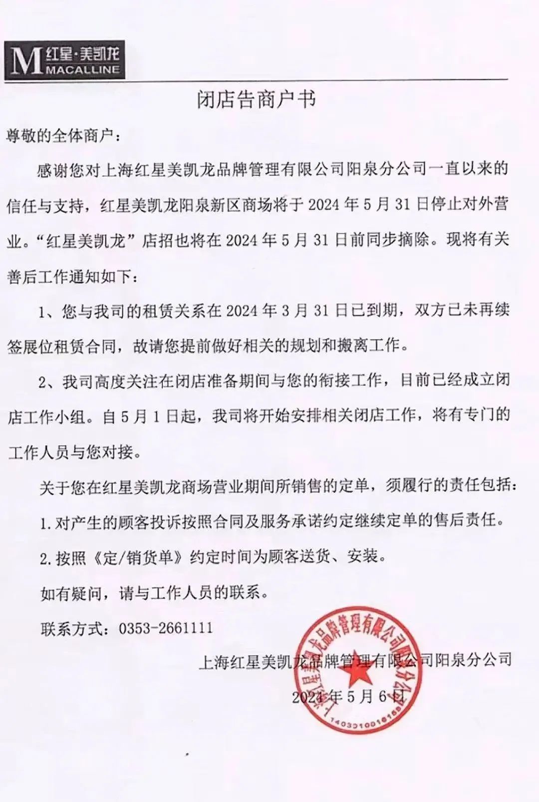 近日,上海紅星美凱龍陽泉分公司宣布,紅星美凱龍陽泉新區(qū)商場將于5月31日停止對外營業(yè),目前已經(jīng)成立閉店工作小組,與商戶進行對接。