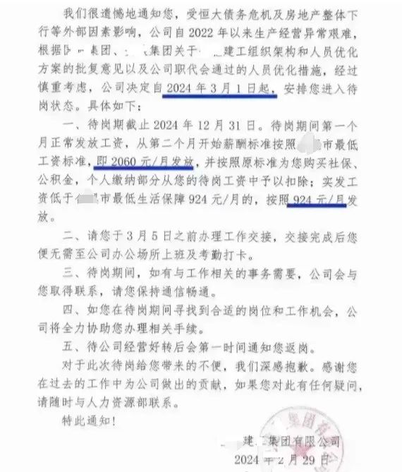 某市建工建團發(fā)了一個人員優(yōu)化的通知:受恒大債務(wù)危機,公司自2022年以來生產(chǎn)異常困難,決定自2024年3月1日起,安排進入待崗狀態(tài)。3月5日前辦理工作交接,后續(xù)無需再上班。