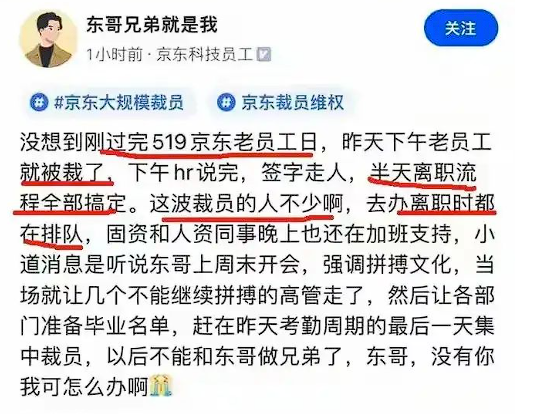 據(jù)多方爆料稱,不少京東員工剛過完老員工日就被裁了。此次大規(guī)模裁員來得十分突然,行動迅速,中午通知裁員,晚上員工賬號和權(quán)限就被關(guān)閉,甚至那些正在寫618需求的技術(shù)員工也被裁掉了。網(wǎng)傳短短幾個小時內(nèi),數(shù)千名京東員工的賬號被封,所在的部門已經(jīng)解散。