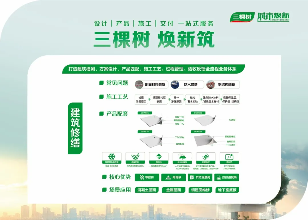 隨后,三棵樹(shù)城市煥新戰(zhàn)略部總監(jiān)兼售前支持部總監(jiān)華政安介紹城市煥新業(yè)務(wù)戰(zhàn)略定位。三棵樹(shù)憑借二十余年深厚的行業(yè)積累,依托全域空間設(shè)計(jì)、全筑美學(xué)理念、綠色產(chǎn)品體系等多方面優(yōu)勢(shì),為城市煥新打造集設(shè)計(jì)、產(chǎn)品、施工、交付于一體的一站式服務(wù)。其中,以內(nèi)外墻無(wú)機(jī)涂料、工程藝術(shù)漆、工程板材,以及基輔材“四大金剛”產(chǎn)品為核心,構(gòu)筑了城市煥新十大場(chǎng)景解決方案,引領(lǐng)行業(yè)邁向更高層次的發(fā)展,全面煥新城市活力。