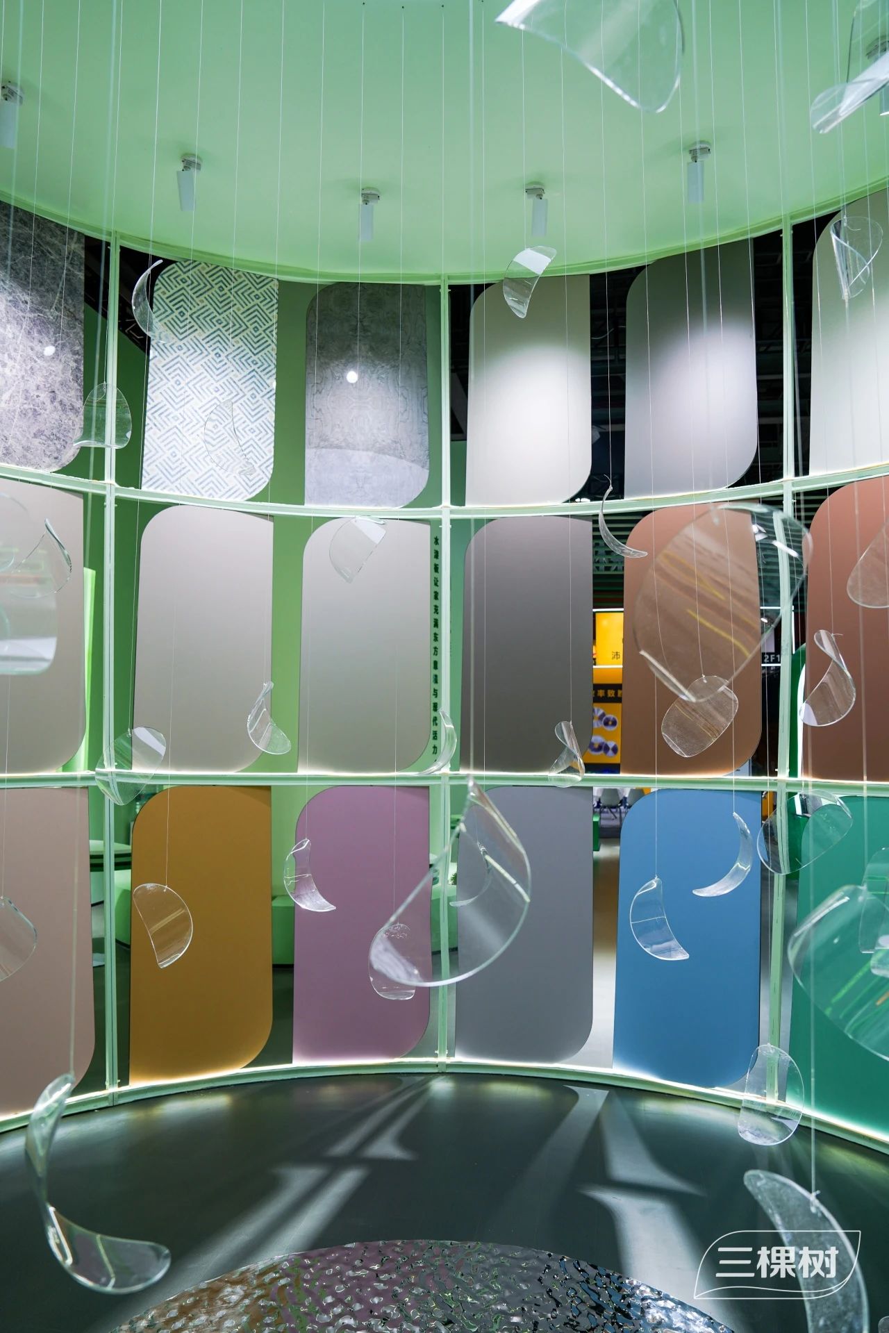 三棵樹小森板展館通過極簡葉型線條與生態(tài)色系,構建出未來感與自然感交融的家居新生態(tài),以“東方美學+漆藝技術”打造沉浸式體驗空間,成為展會焦點,開展首日便吸引數千名行業(yè)專業(yè)人士與消費者目光。其中,核心筒區(qū)域的“水瀑裝置”采用動態(tài)光影與冰透流蘇葉片效果,模擬水瀑流動的光線變化,配合360°板材環(huán)繞展示裝置,讓觀眾瞬間置身清新生動的自然場景。