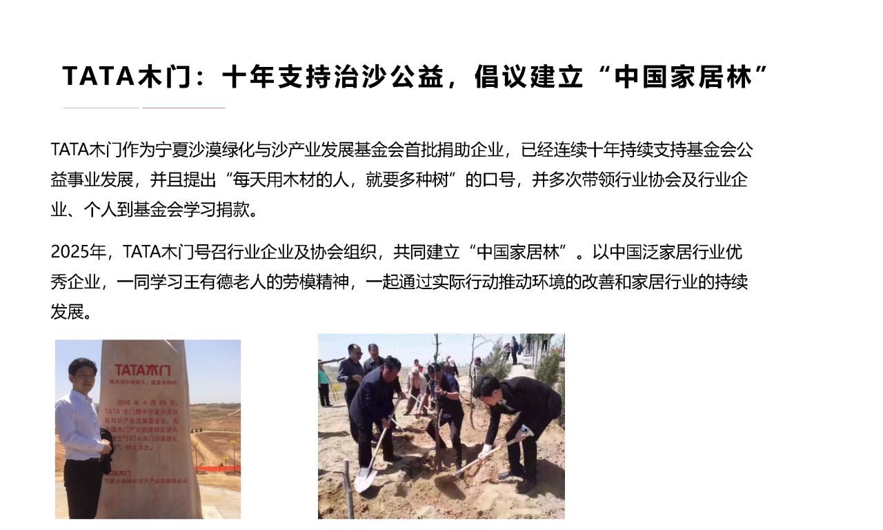 “中國(guó)家居林”創(chuàng)建不僅是一次公益實(shí)踐,更是一場(chǎng)綠色革命的起點(diǎn)。展辰呼吁更多家居企業(yè)加入這場(chǎng)“逐沙”行動(dòng),與TATA木門(mén)、科寶·博洛尼等伙伴同行,將綠色責(zé)任融入生產(chǎn)、設(shè)計(jì)與服務(wù),讓每件家居作品都承載生態(tài)使命。攜手種下“中國(guó)家居林”,不僅是對(duì)自然的回饋,更是對(duì)消費(fèi)者、對(duì)行業(yè)、對(duì)未來(lái)的鄭重承諾。讓我們以木為媒,以林為證,共筑人與自然和諧共生的美好家園!