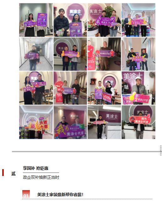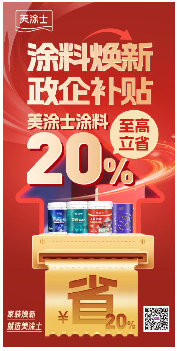 隨著2025年新一輪勁爆國補火熱來襲,美涂士快速響應號召,積極參與各地家裝“煥新”補貼活動,因地制宜在全國范圍內推出多項鉅惠購漆政策,政企雙重補貼,煥新美家至高立省20%,無論是新房裝修亦或者舊房翻新,消費者均能享受到美涂士藝術漆、仿石漆、乳膠漆、防水基輔材四大品類產(chǎn)品帶來的多重福利。