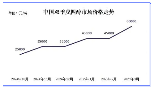 眼看進入“金三銀四”的全年第一個小陽春,化工領(lǐng)域的市場雖未出現(xiàn)預(yù)期中的火爆,但價格的上漲卻是延續(xù)已久,其中雙季戊四醇的價格表現(xiàn)尤為亮眼。從去年10月至今,雙季戊四醇由2萬元/噸上漲至5.5萬元/噸,漲幅達175%。