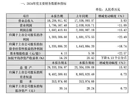 公告顯示,截至報告期末,萬華總資產(chǎn)為29.333.334.97萬元,較期初增長15.92%;歸屬于上市公司股東的所有者權(quán)益為9.462.589.61萬元,較期初增長6.73%。報告期內(nèi),該公司主要產(chǎn)品銷量持續(xù)增長,但受市場價格和原料成本波動因素影響,整體毛利同比基本持平;科研投入持續(xù)增加,銷售、管理、財務(wù)等三項費(fèi)用同比增長;同時對部分投資項目計提資產(chǎn)減值準(zhǔn)備或報廢處理,2024年歸屬于上市公司股東的凈利潤比上年同期下降22.49%。
