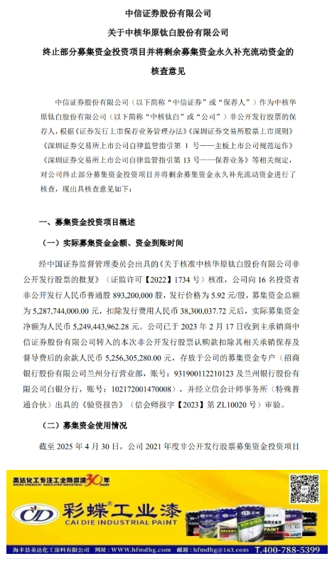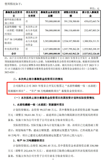 6月2日,中核華原鈦白股份有限公司公告稱,擬終止公司2021年度非公開發(fā)行股票之“水溶性磷酸一銨(水溶肥)資源循環(huán)項(xiàng)目”及“年產(chǎn)50萬噸磷酸鐵項(xiàng)目”募集資金投資項(xiàng)目,并將剩余募集資金16.66億元永久補(bǔ)充流動(dòng)資金,用于公司日常生產(chǎn)經(jīng)營(yíng)及業(yè)務(wù)發(fā)展。